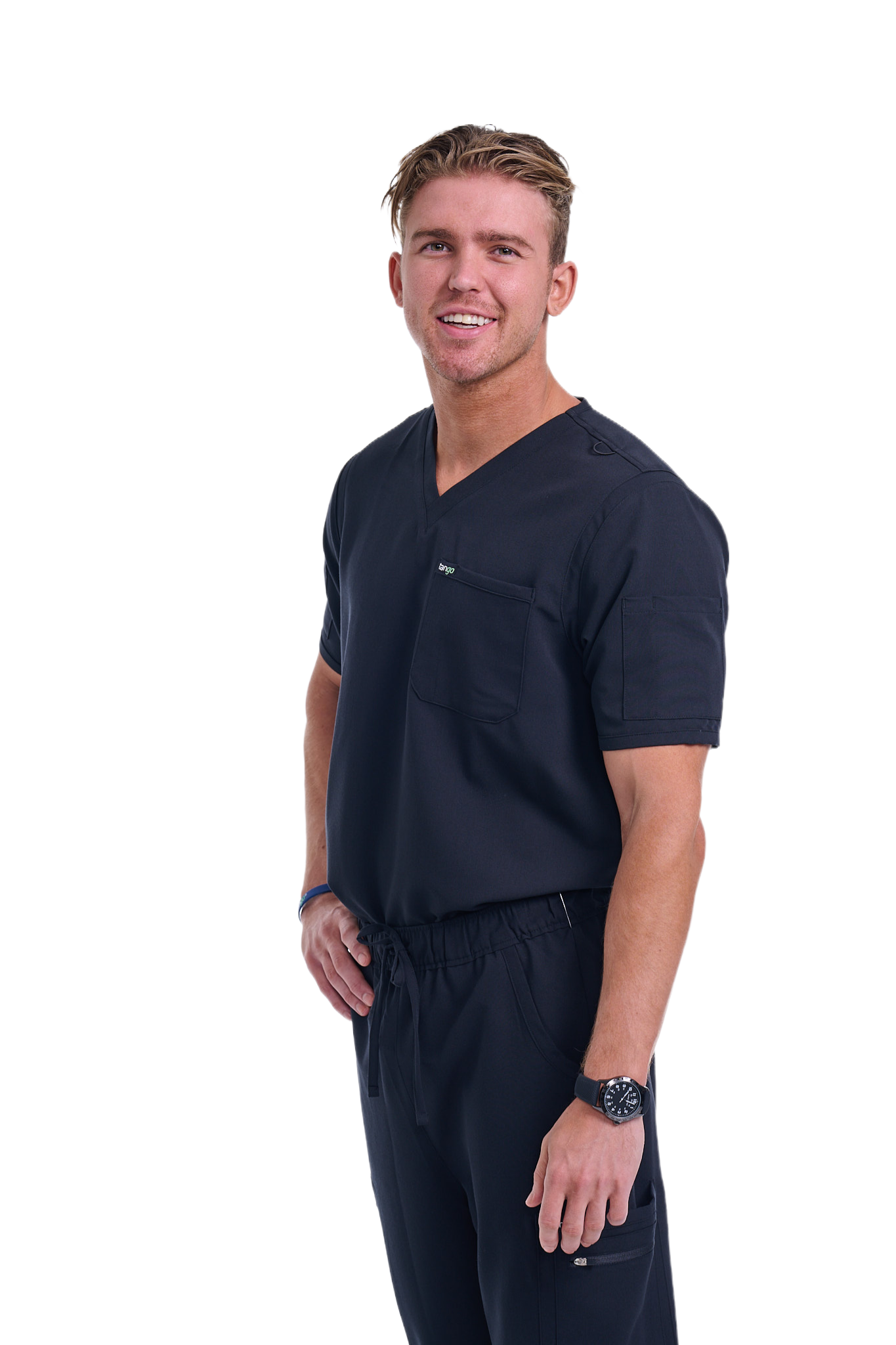 Unite style and functionality with the Jet Black / Olive Men's Scrub Top.
